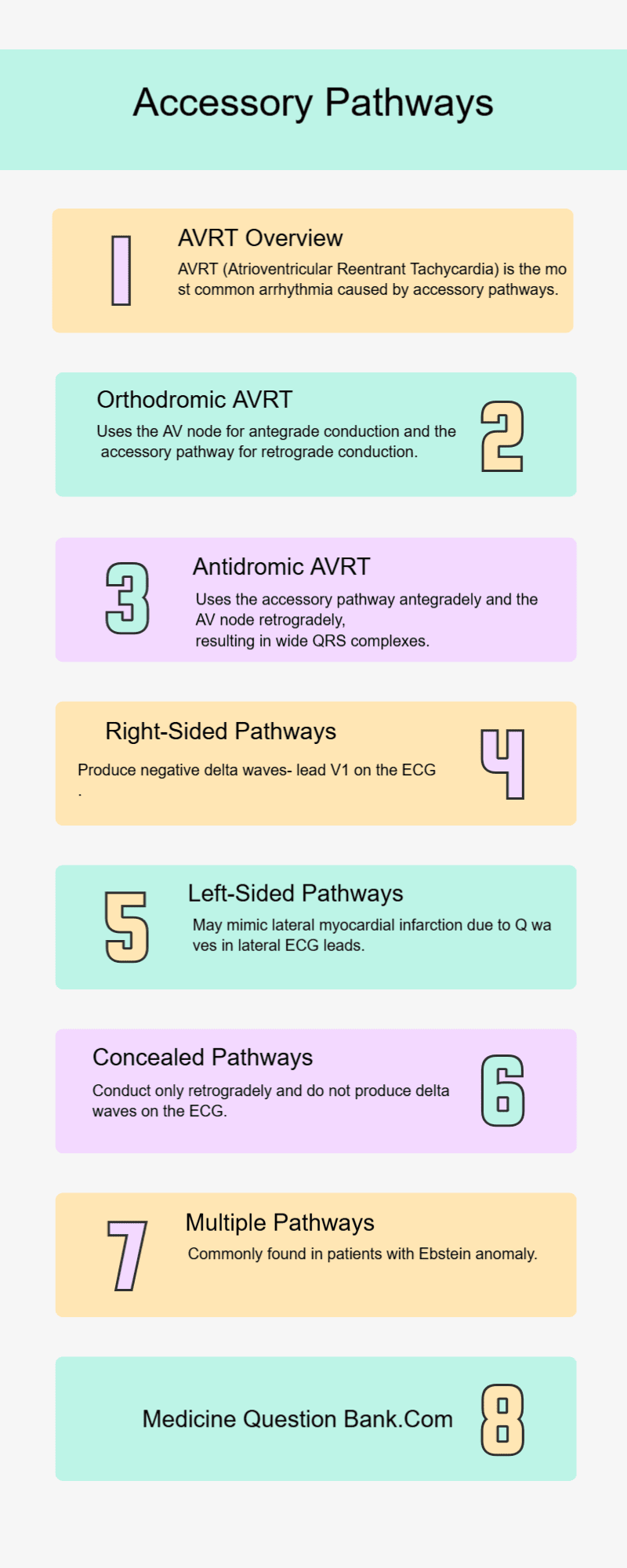 | 8 | Antidromic AVRT uses the accessory pathway antegradely and the AV node retrogradely, producing wide QRS complexes. |