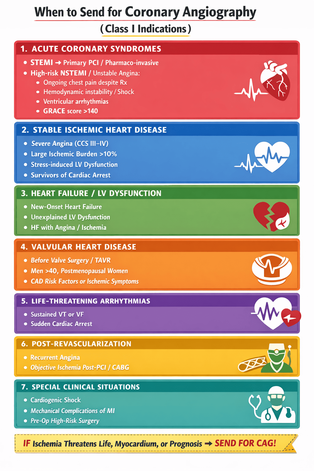 Any patient with ACS, high-risk ischemia, refractory angina, ischemic cardiomyopathy, or life-threatening arrhythmias has a Class I indication for coronary angiography.