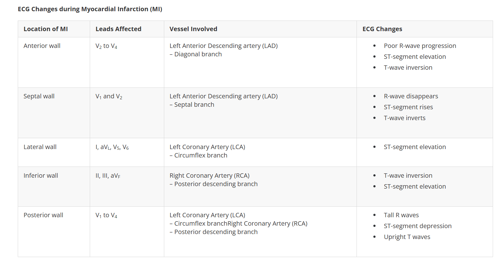 • Anterior/Septal MI: Leads V1, V2, V3, V4 (often associated with occlusion of the Left Anterior Descending artery – LAD)