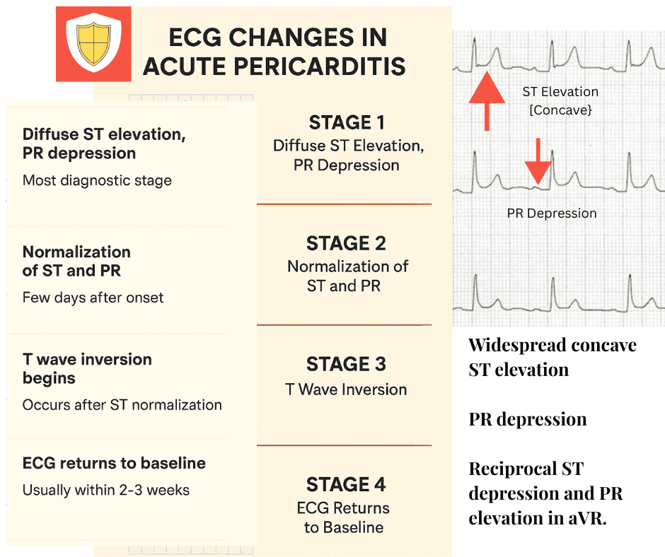 | PR Segment Changes | PR depression in most leads; PR elevation in aVR, V1 | Reflects atrial epicardial inflammation |