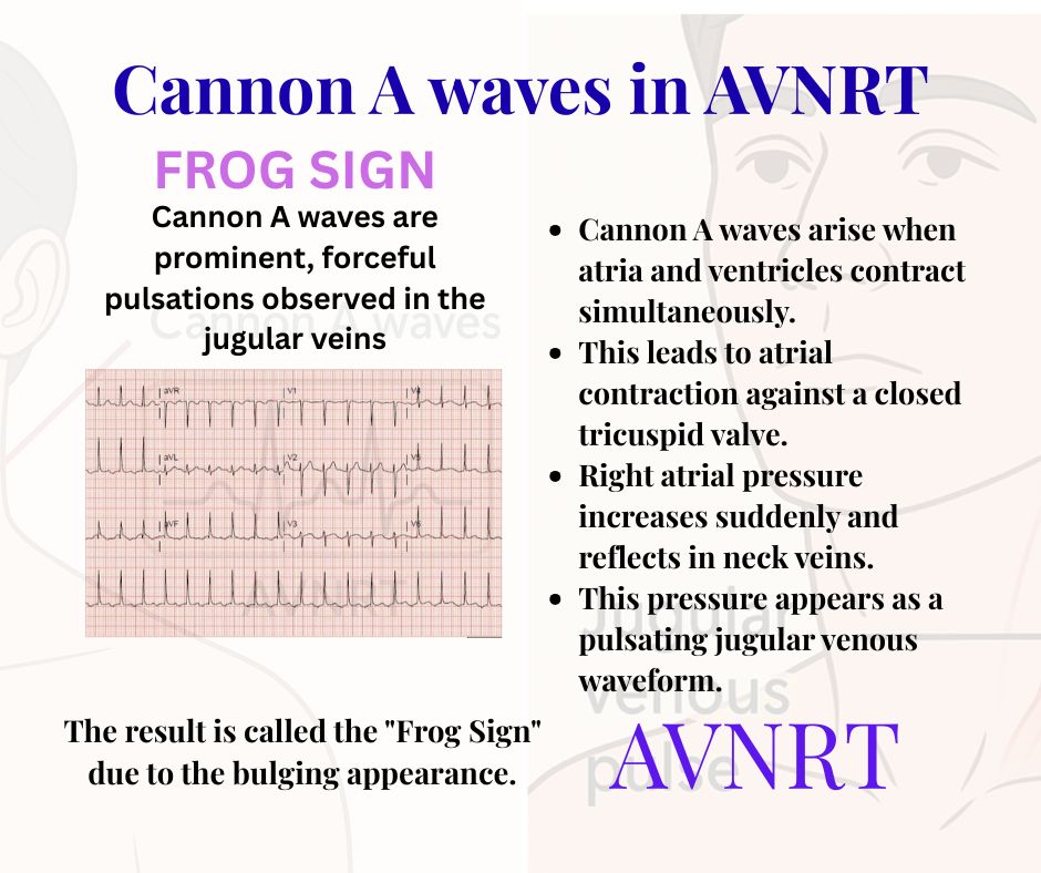 Explanation: AVNRT is associated with AV dissociation during tachycardia, causing visible cannon A waves—termed Frog Sign.