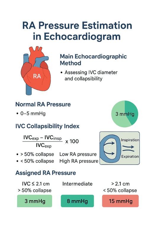 Educational infographic showing echocardiographic methods for estimating right atrial (RA) pressure, including IVC diameter and collapsibility index, Doppler assessment, and associated RA pressure values