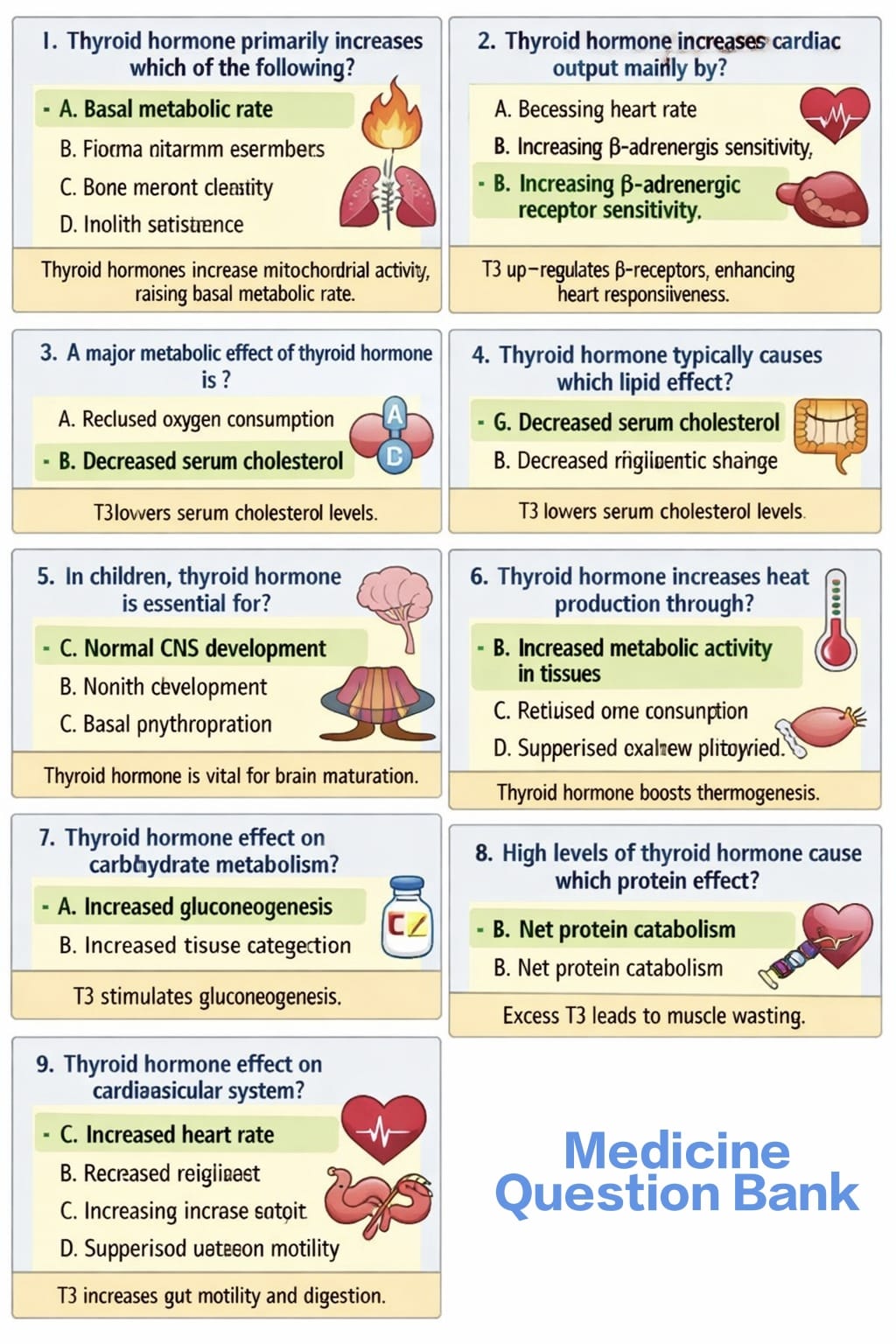 Basal metabolic rate ↑, Thermogenesis (heat production), Oxygen consumption ↑, Heart rate ↑, Cardiac output ↑, β-adrenergic receptor up-regulation, Gluconeogenesis ↑, Lipolysis & ↓ serum cholesterol, CNS development (children), Protein catabolism (excess T3/T4)