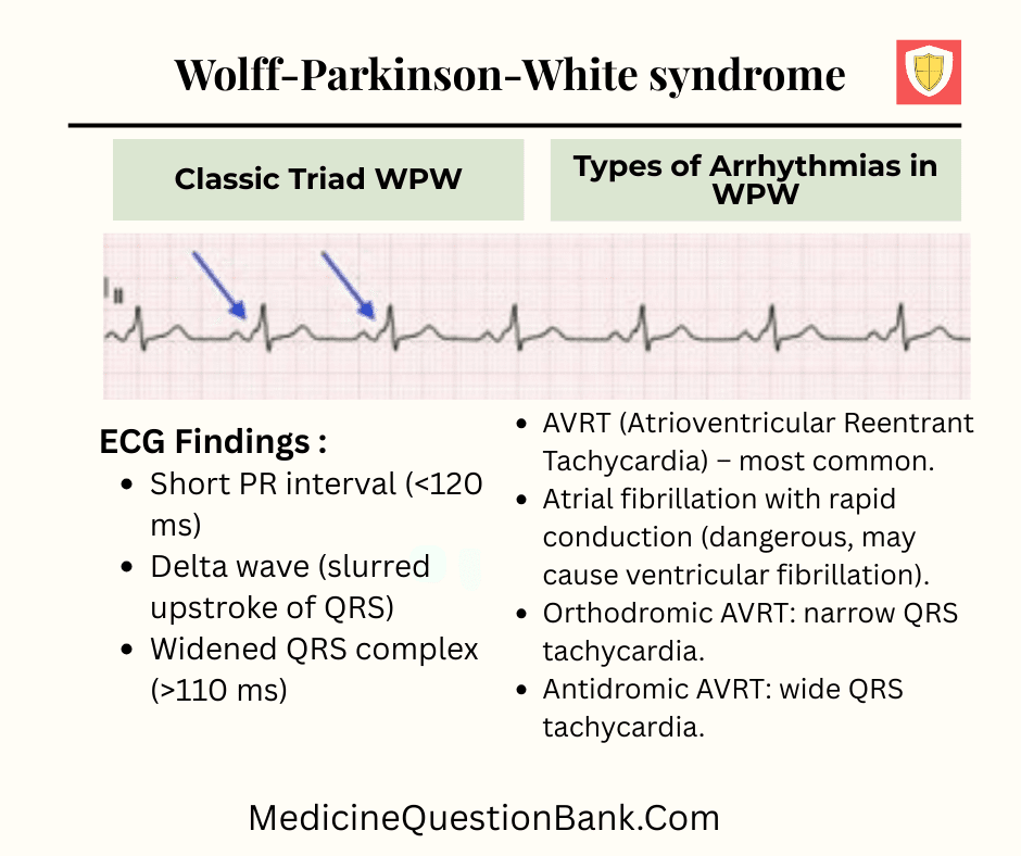 Wolff–Parkinson–White syndrome, WPW syndrome, WPW pattern, Accessory pathway, Bundle of Kent, Pre-excitation syndrome, Short PR interval, Delta wave, Wide QRS complex, Type A WPW, Type B WPW, Type C WPW, Left-sided WPW, Right-sided WPW, Septal WPW, LBBB mimic, RBBB mimic, AV reentrant tachycardia, Orthodromic AVRT, Antidromic AVRT, Pre-excited atrial fibrillation, Supraventricular tachycardia, Ventricular fibrillation, Sudden cardiac death, Procainamide, Ibutilide, Avoid AV nodal blockers, Verapamil contraindication, Digoxin contraindication, Adenosine contraindication, Radiofrequency ablation, Catheter ablation, Electrophysiology study, Lown–Ganong–Levine syndrome, AV nodal reentrant tachycardia, Bundle branch block mimic, Paroxysmal supraventricular tachycardia